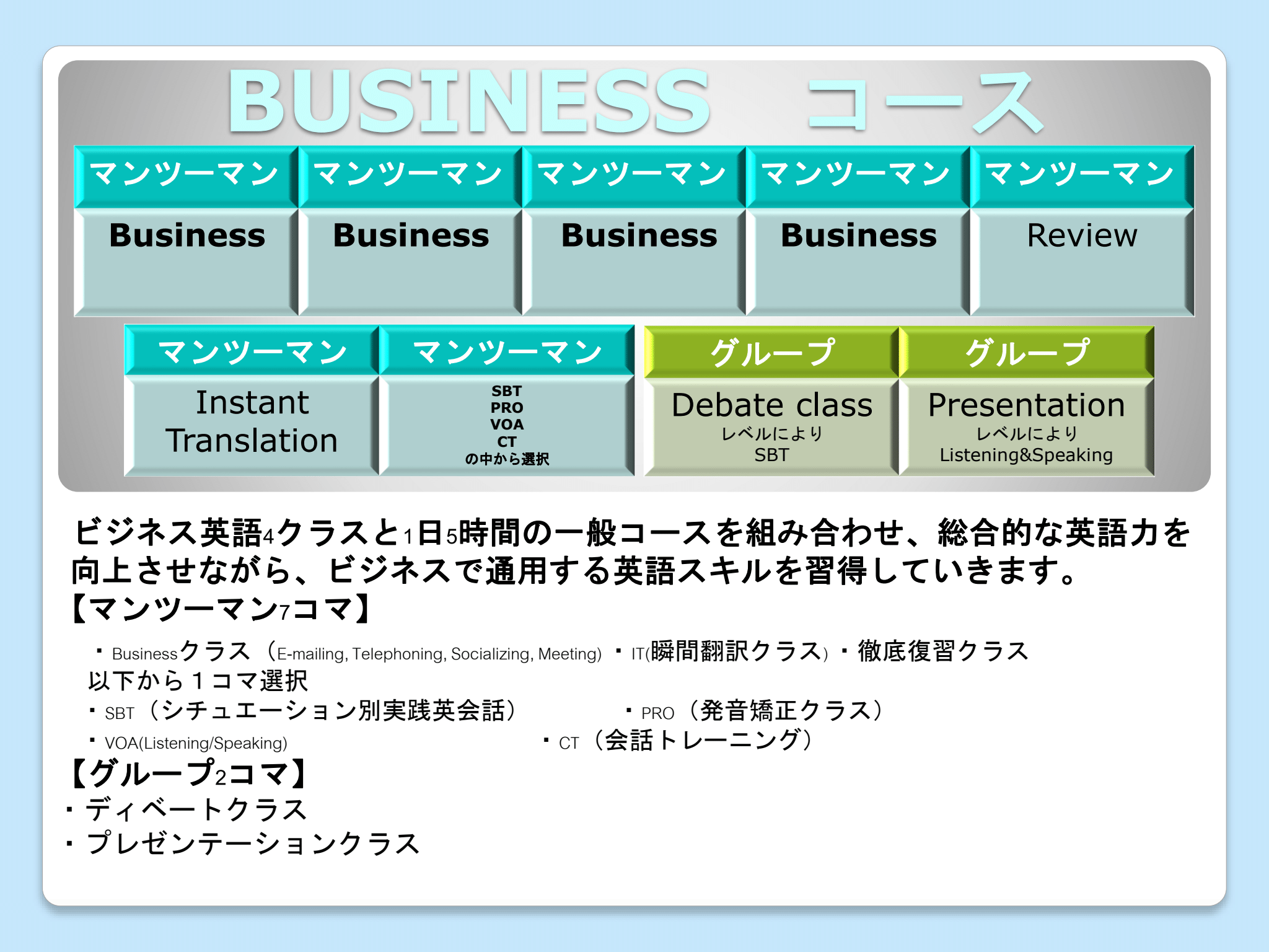 ビジネス英語のクラスだけではなく、グループクラスやIT(瞬間翻訳)のクラスを同時におこなっていく事により、総合的な語学力の向上を目指します。
