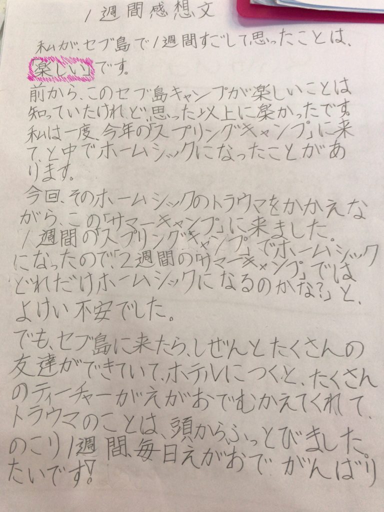 前回、ホームシックになった生徒からこんな感想をもらいました。