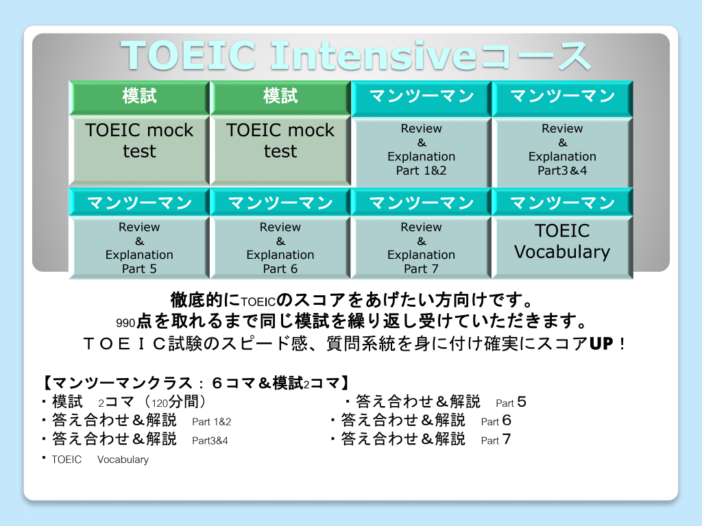 集中して効果的にTOIEC対策の勉強をすすめていき、一緒にスコアアップを狙いますしょう!!