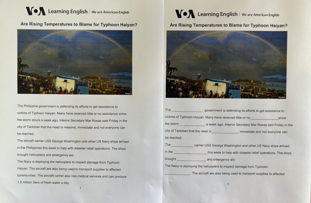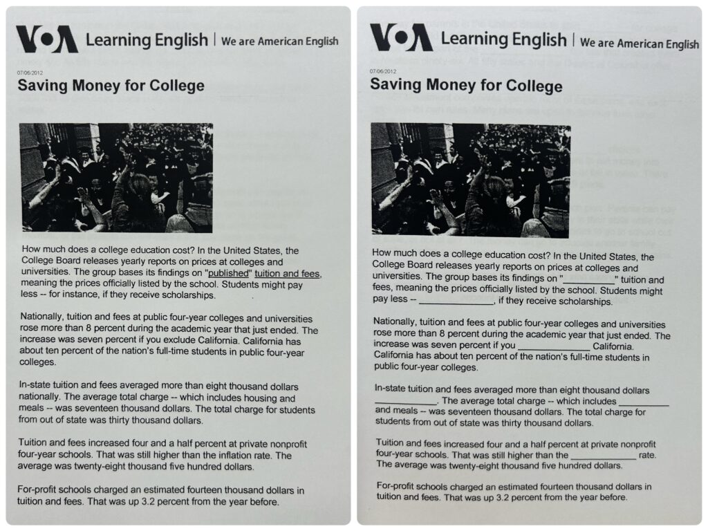 教材には記事の全文が記入されているページと単語の空欄が空いている穴埋め用ページがあります。