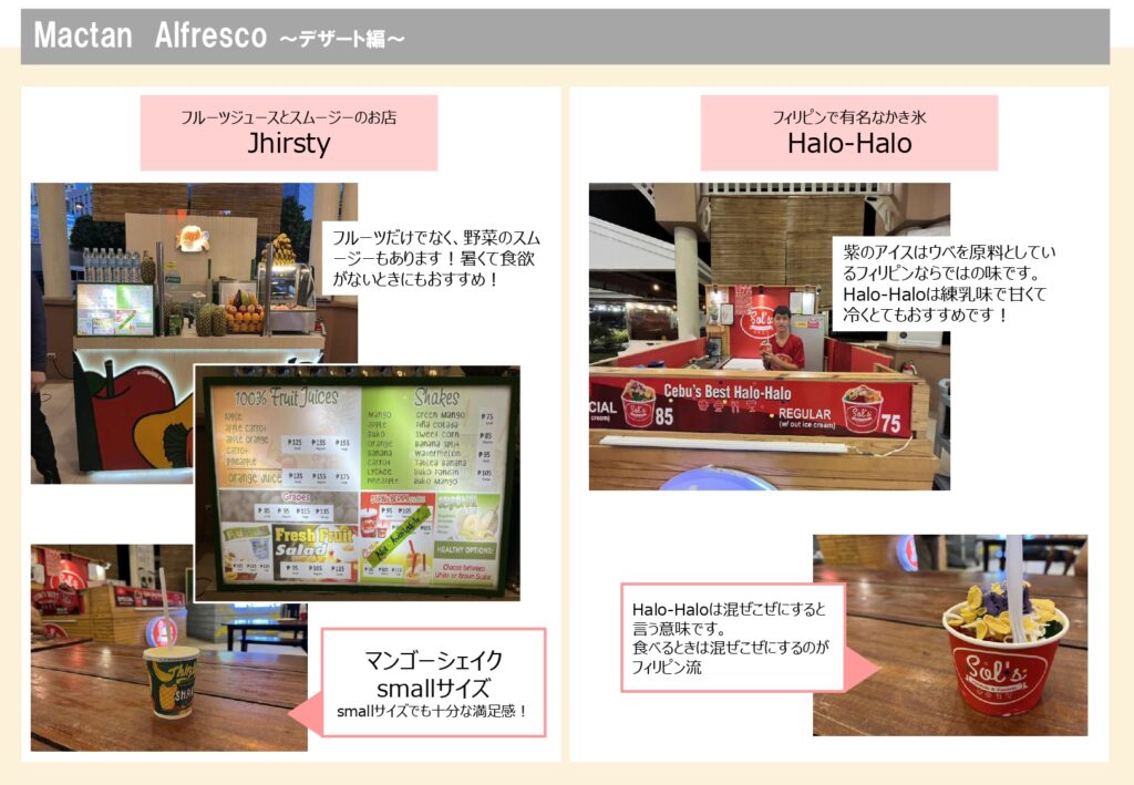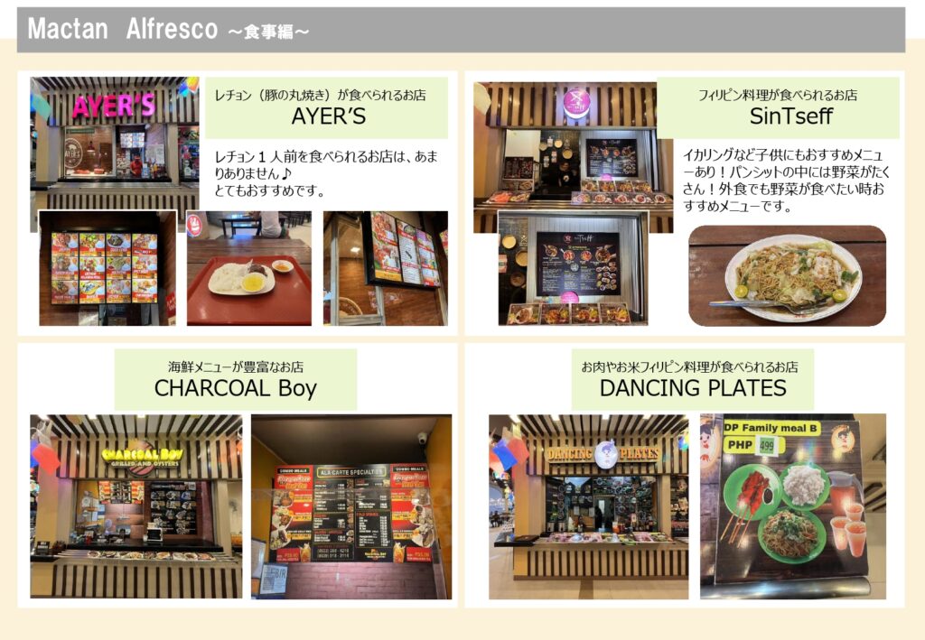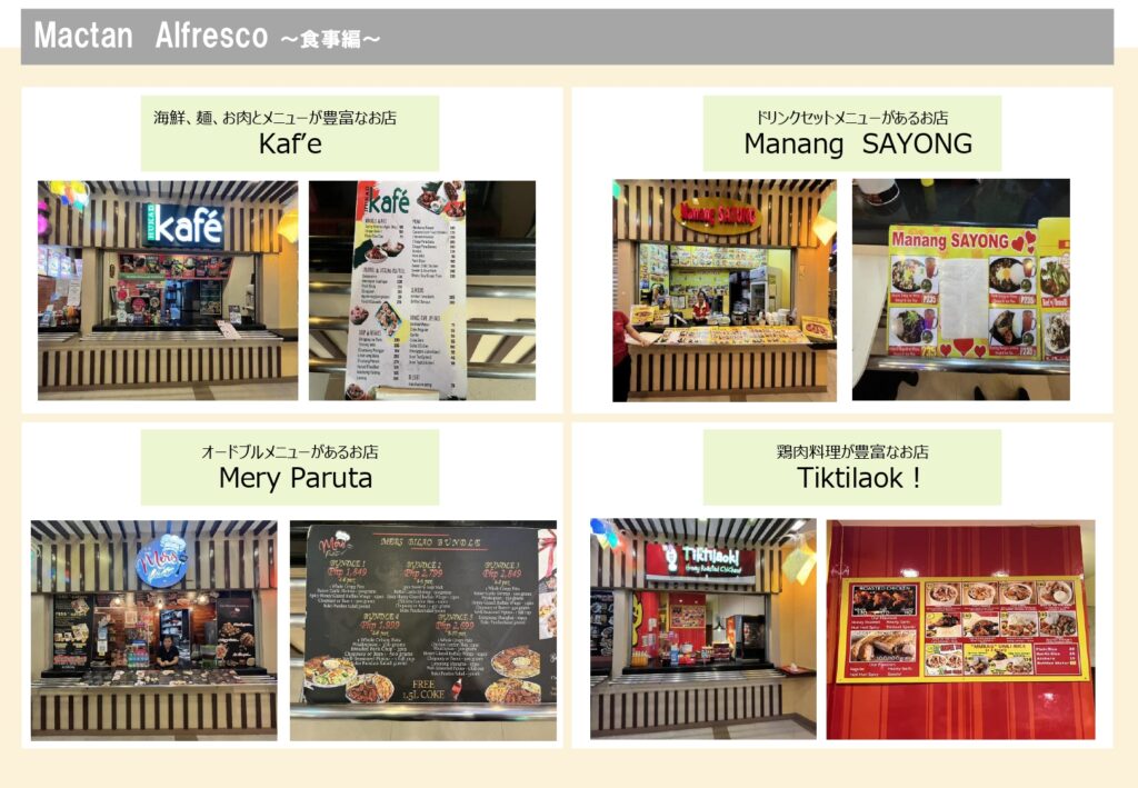 マクタンニュータウン内にフードコートでは、フィリピン料理、シーフード料理、デザート等、選択肢が豊富にあり、気軽に食事をとれるフードコートです。