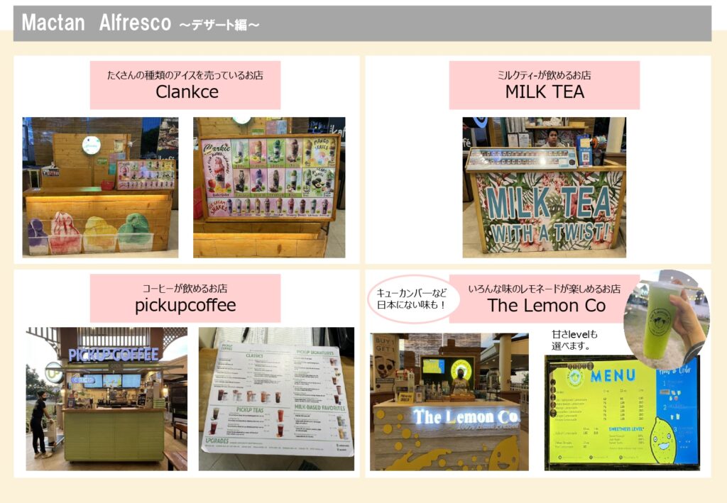 教室のある「マクタンニュータウン」には多数のお店が揃っており、コンビニ、マクドナルド、カフェ、日本食屋、フードコート、スーパー、薬局、ATMなど様々な施設がございます。