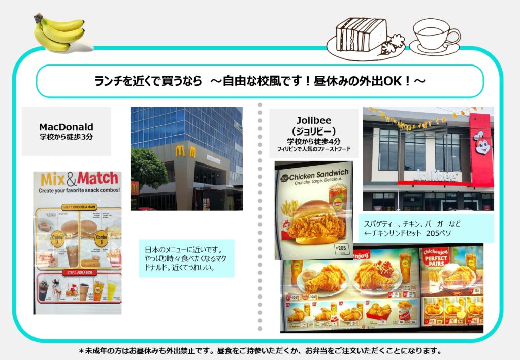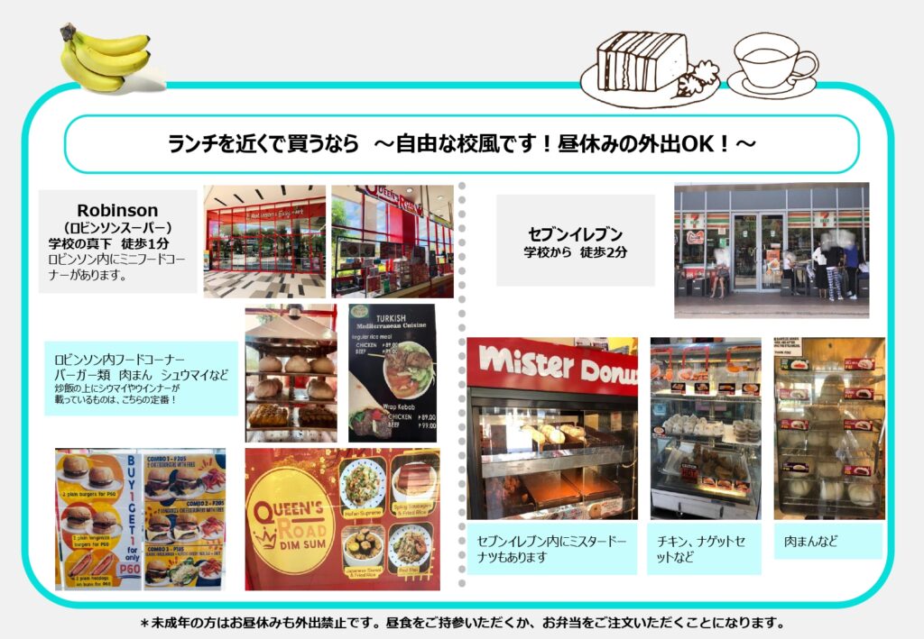 学校から近いお店ですと、STARBUCKSマクタンニュータウン店(学校から徒歩1分程)があります。